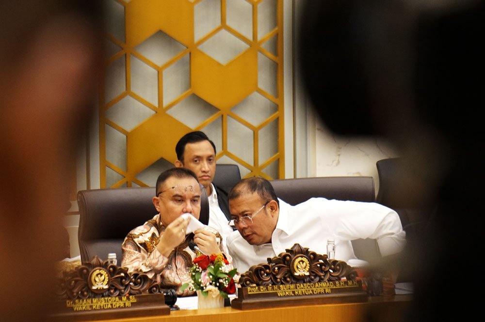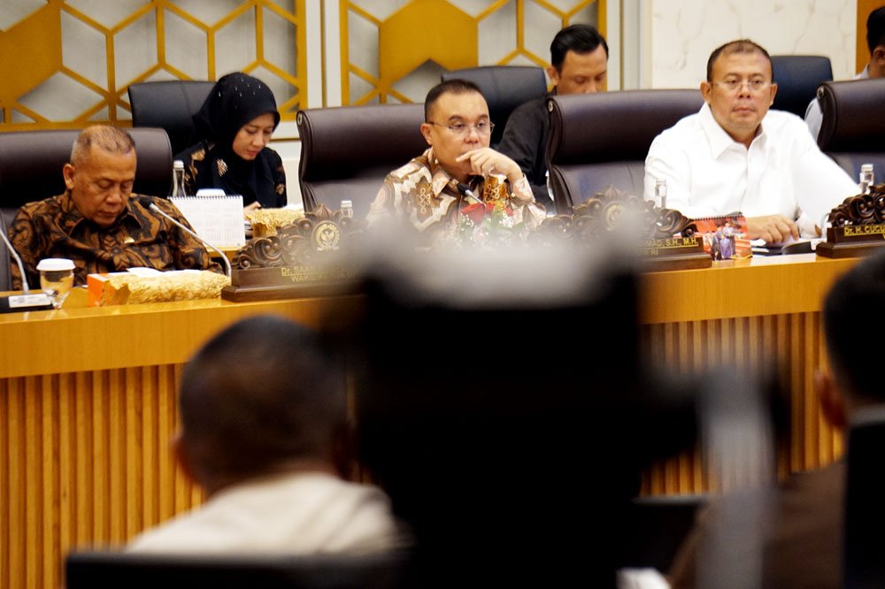 Pimpinan DPR RI saat menerima audiensi dari Koalisi Nasional Reforma Agraria di Kompleks Parlemen Senayan, Jakarta, Kamis (2/10/2025). Koalisi masyarakat diterima oleh Wakil Ketua DPR Sufmi Dasco Ahmad, Saan Mustopa, dan Cucun Syamsurijal.