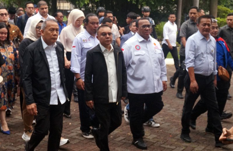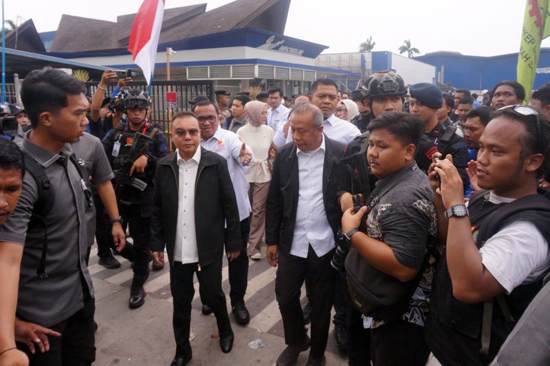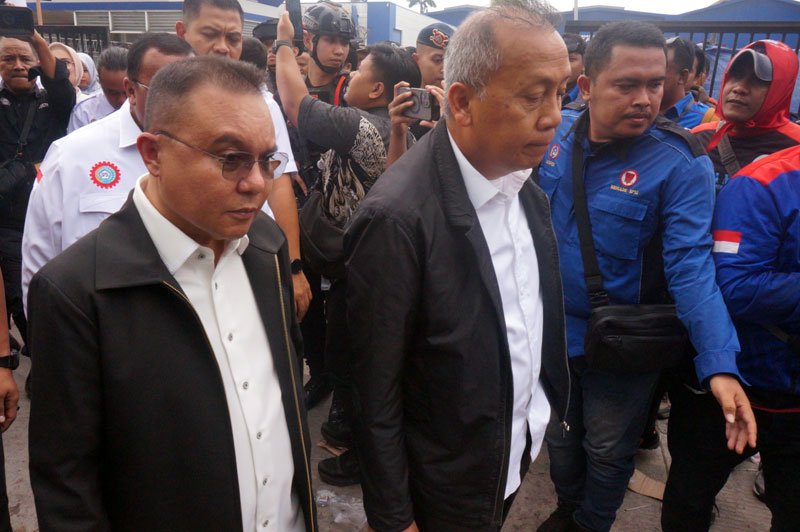 Wakil Ketua DPR RI Dasco didampingi Wakil Ketua DPR RI Saan Mustopa, menemui Konfederasi Serikat Pekerja Seluruh Indonesia (KSPSI) yang menggelar aksi unjuk rasa pabrik ban Michelin milik PT Multistrada Arah Sarana Tbk, Cikarang, Jawa Barat, Senin (3/11/2025).